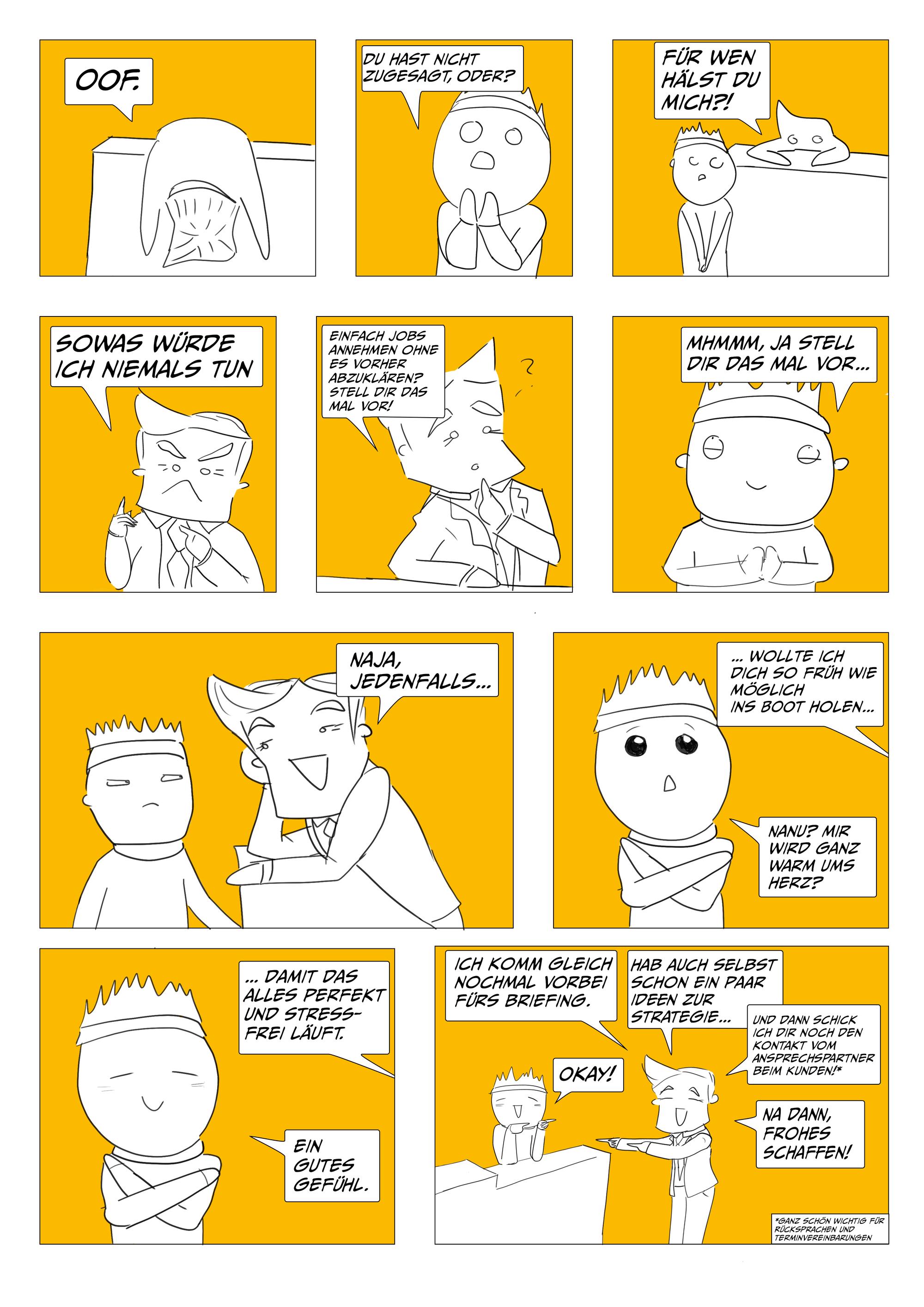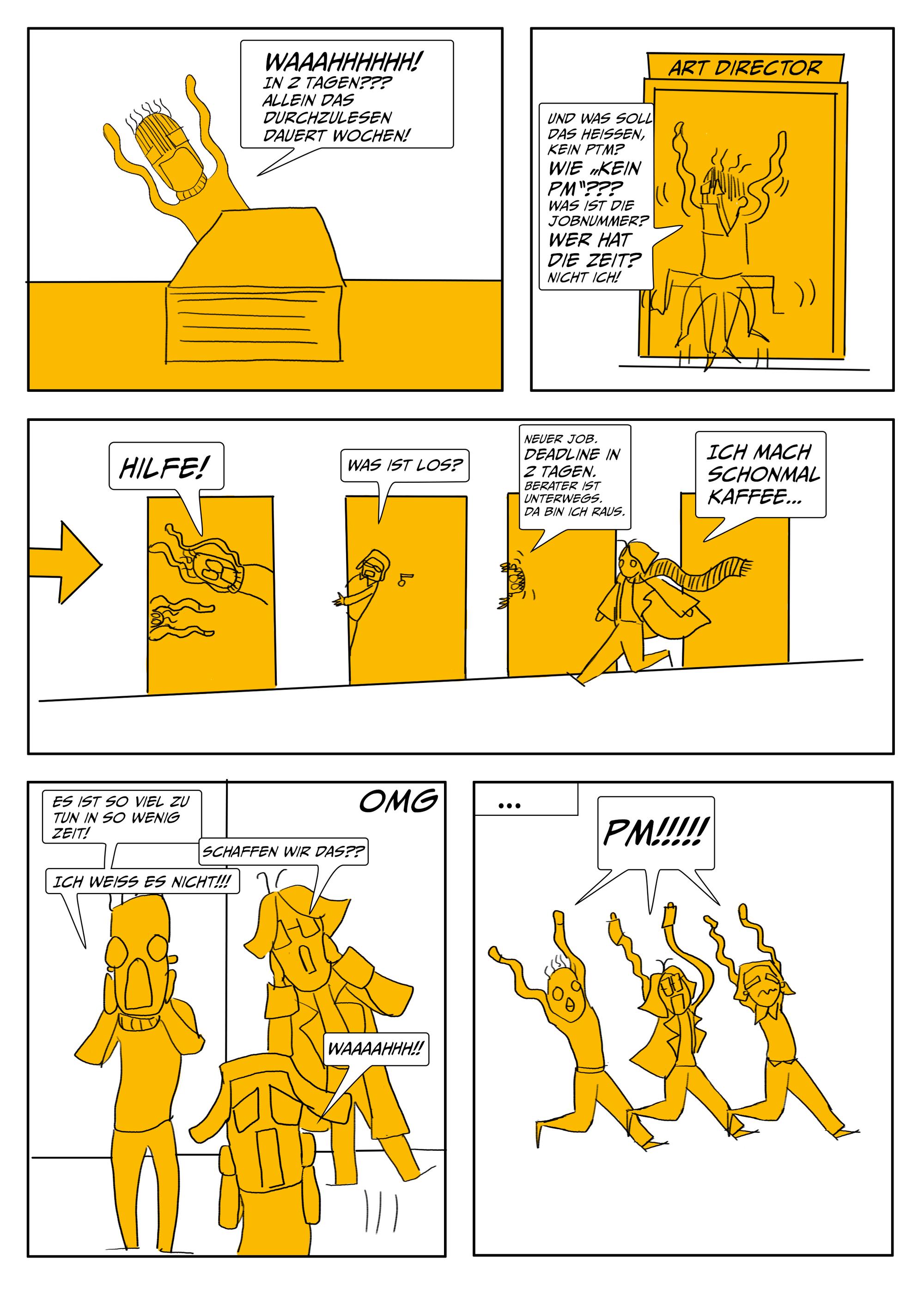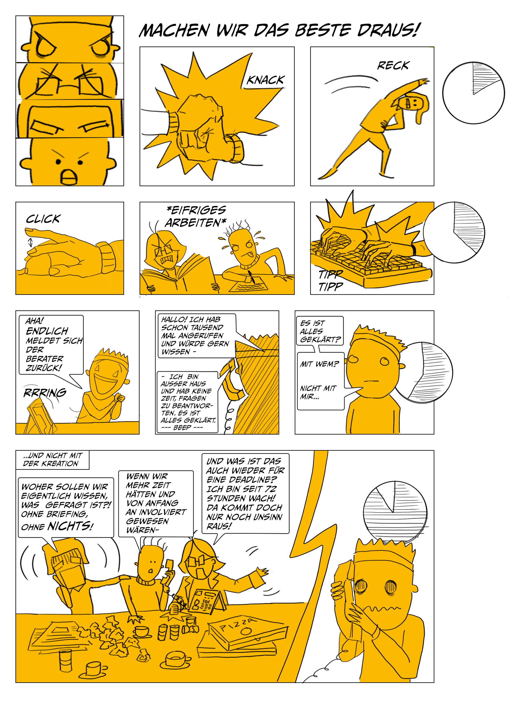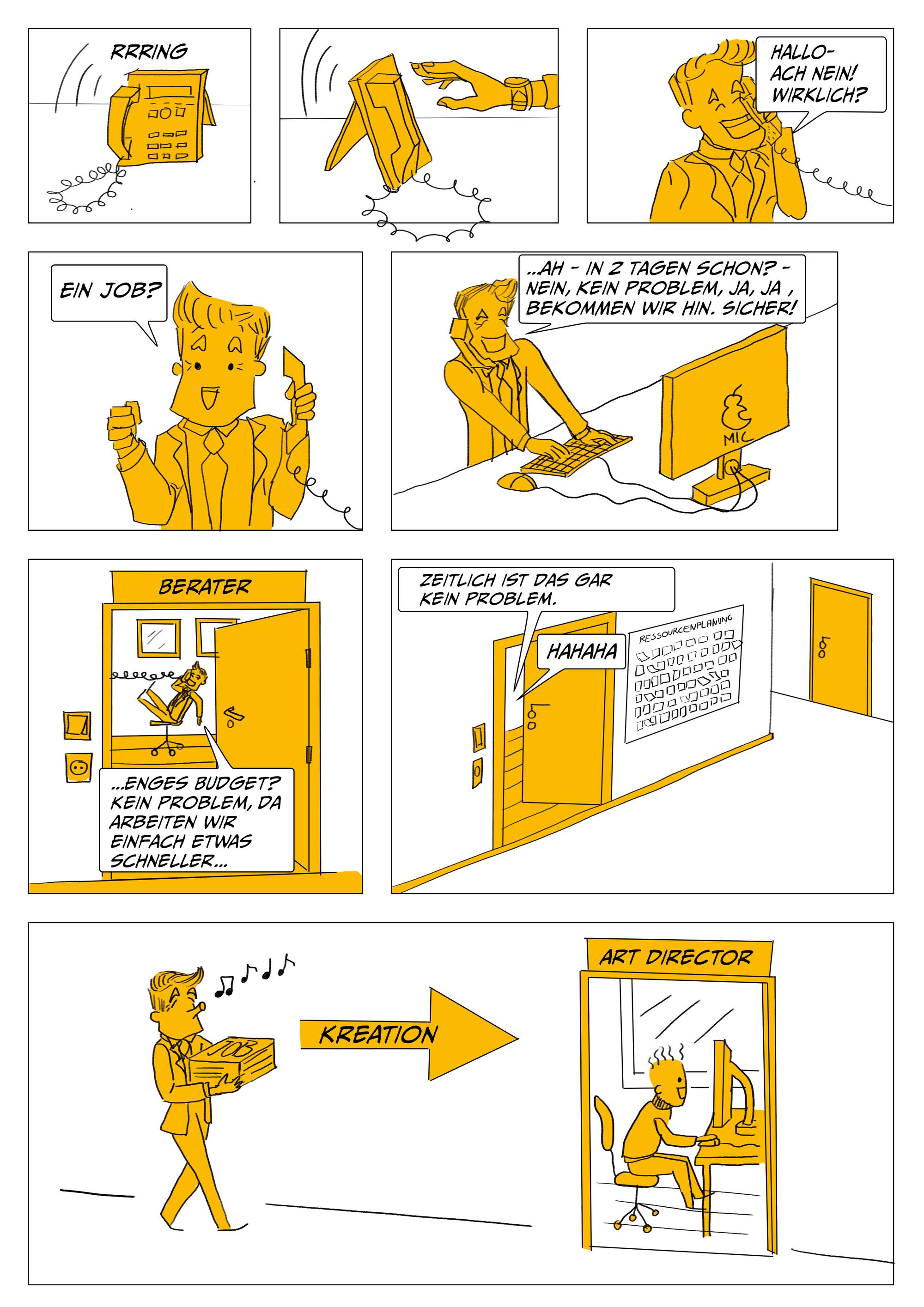 Um die gute Zusammenarbeit zwischen den unterschiedlichen Rollen in einer Kreativagentur zu fördern, werden worst case und best case scenarios anhand der Zusammenarbeit zwischen Kreation, Projektmanagement, Beratung und Kundschaft vermittelt.