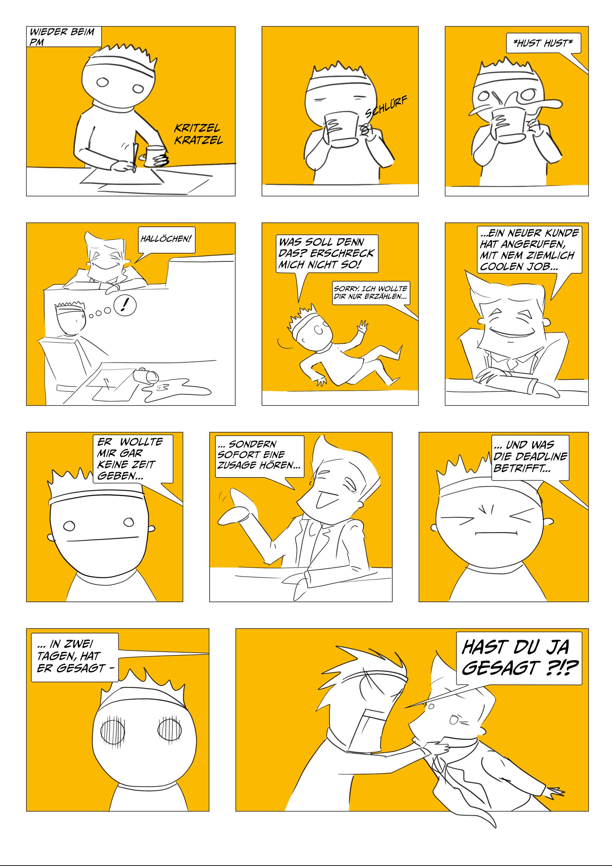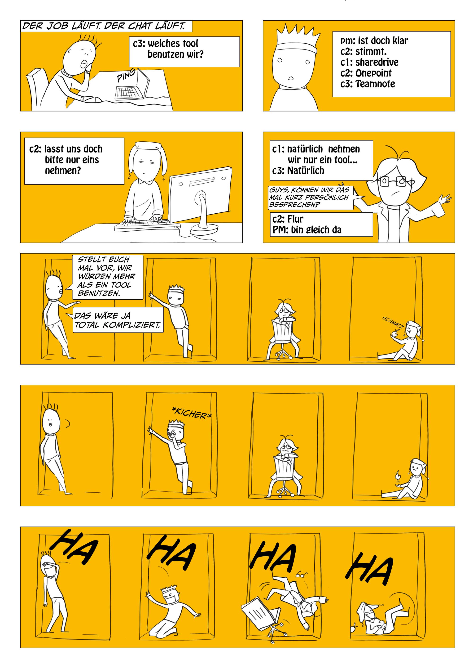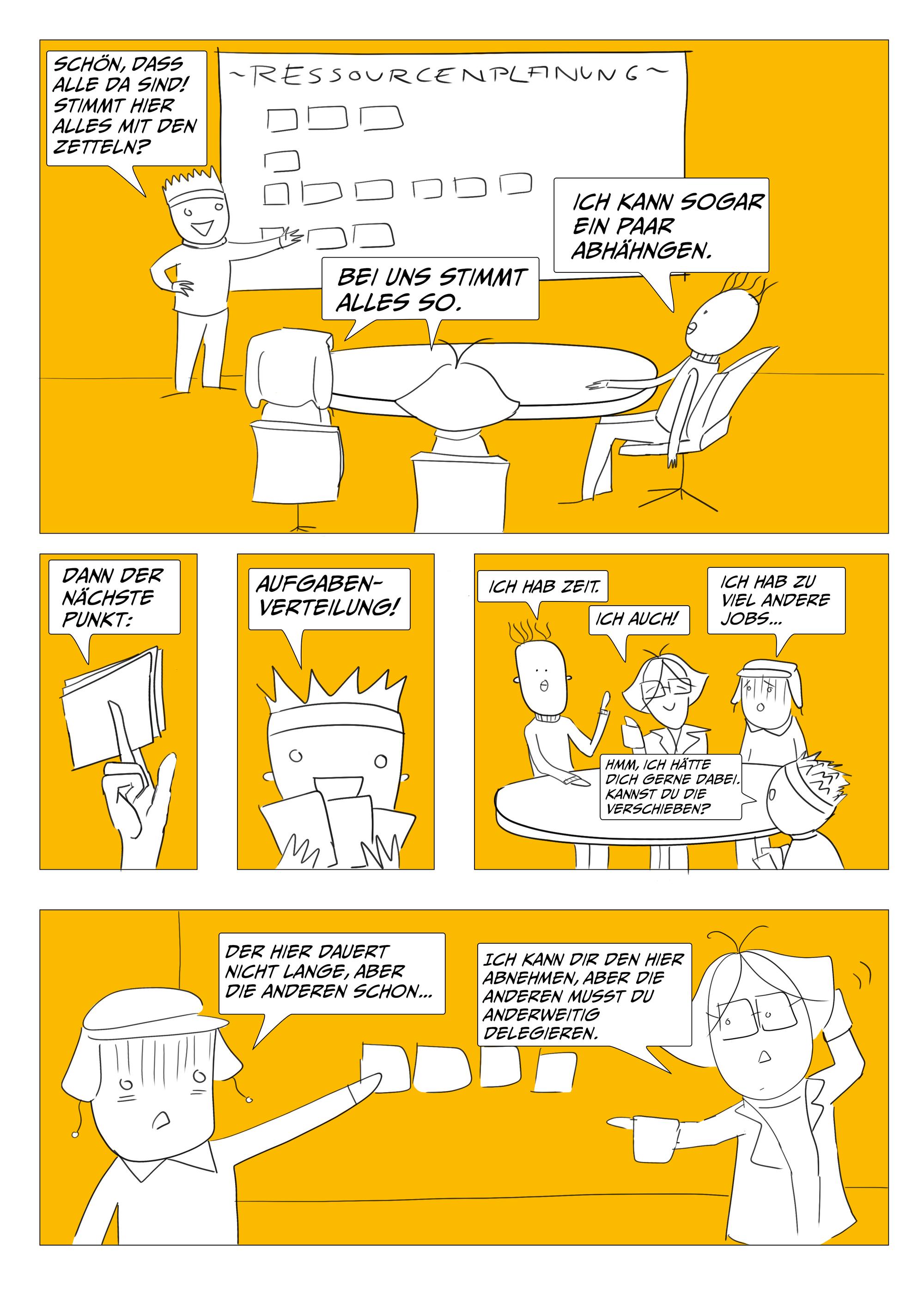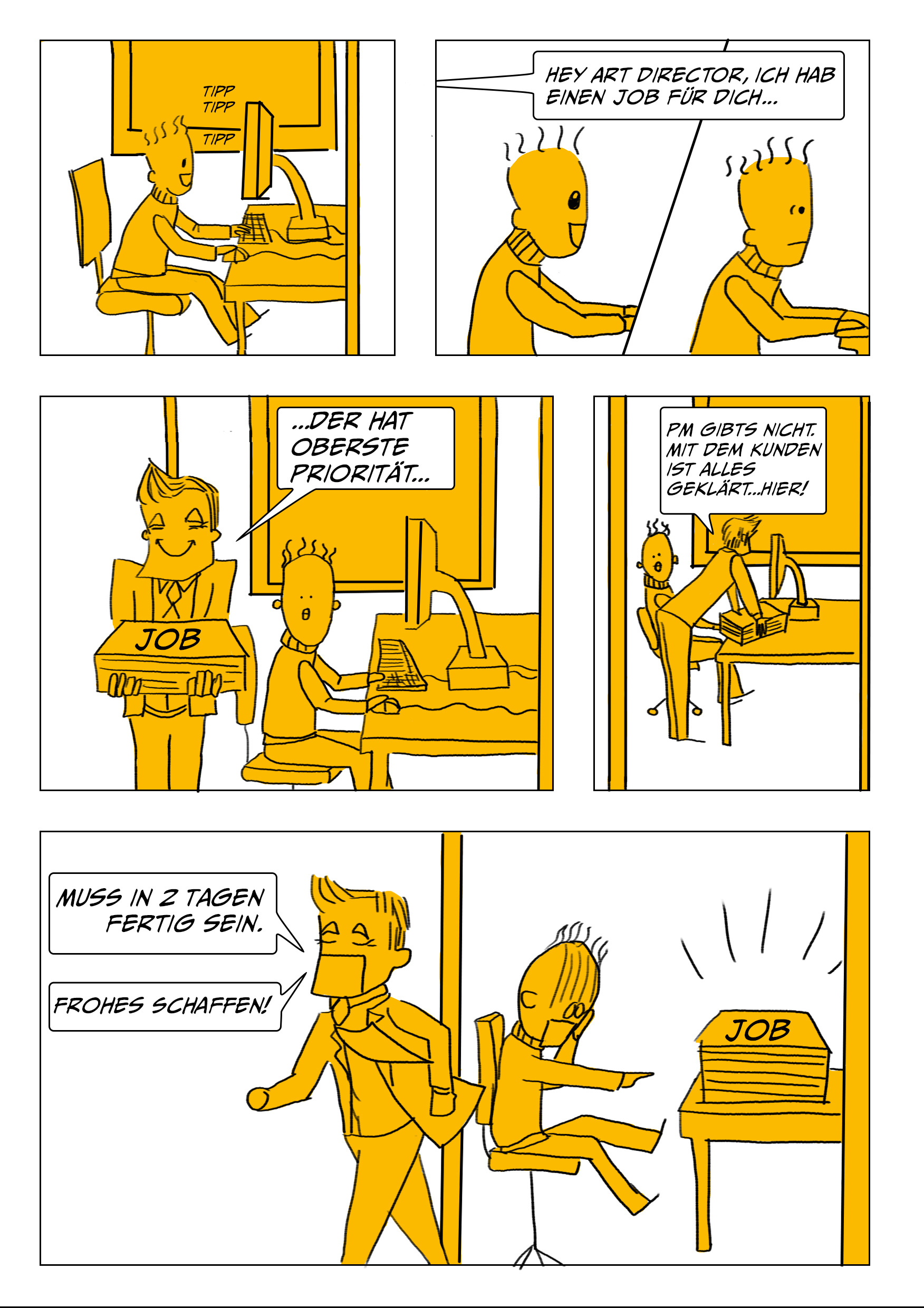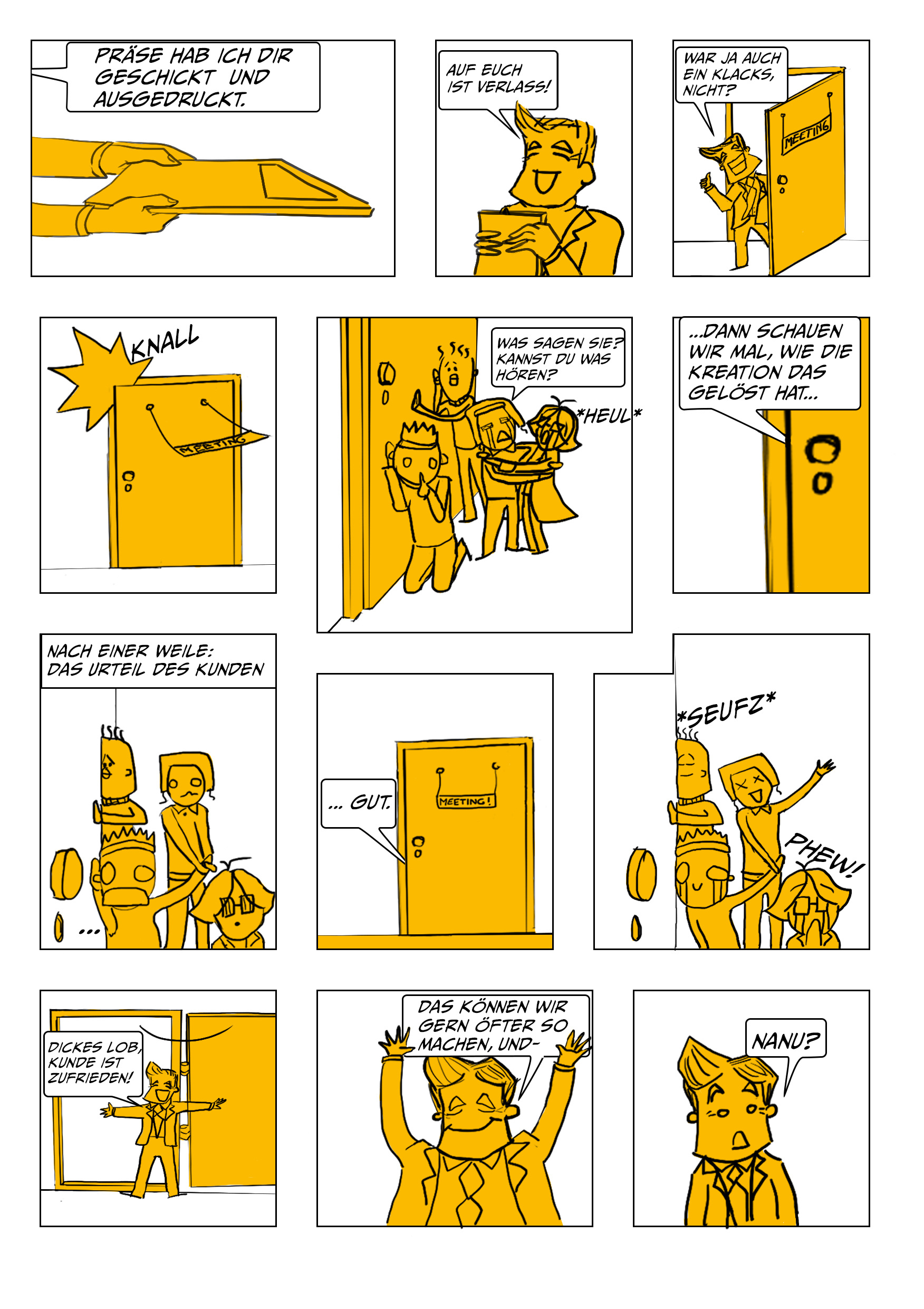 Um die gute Zusammenarbeit zwischen den unterschiedlichen Rollen in einer Kreativagentur zu fördern, werden worst case und best case scenarios anhand der Zusammenarbeit zwischen Kreation, Projektmanagement, Beratung und Kundschaft vermittelt.