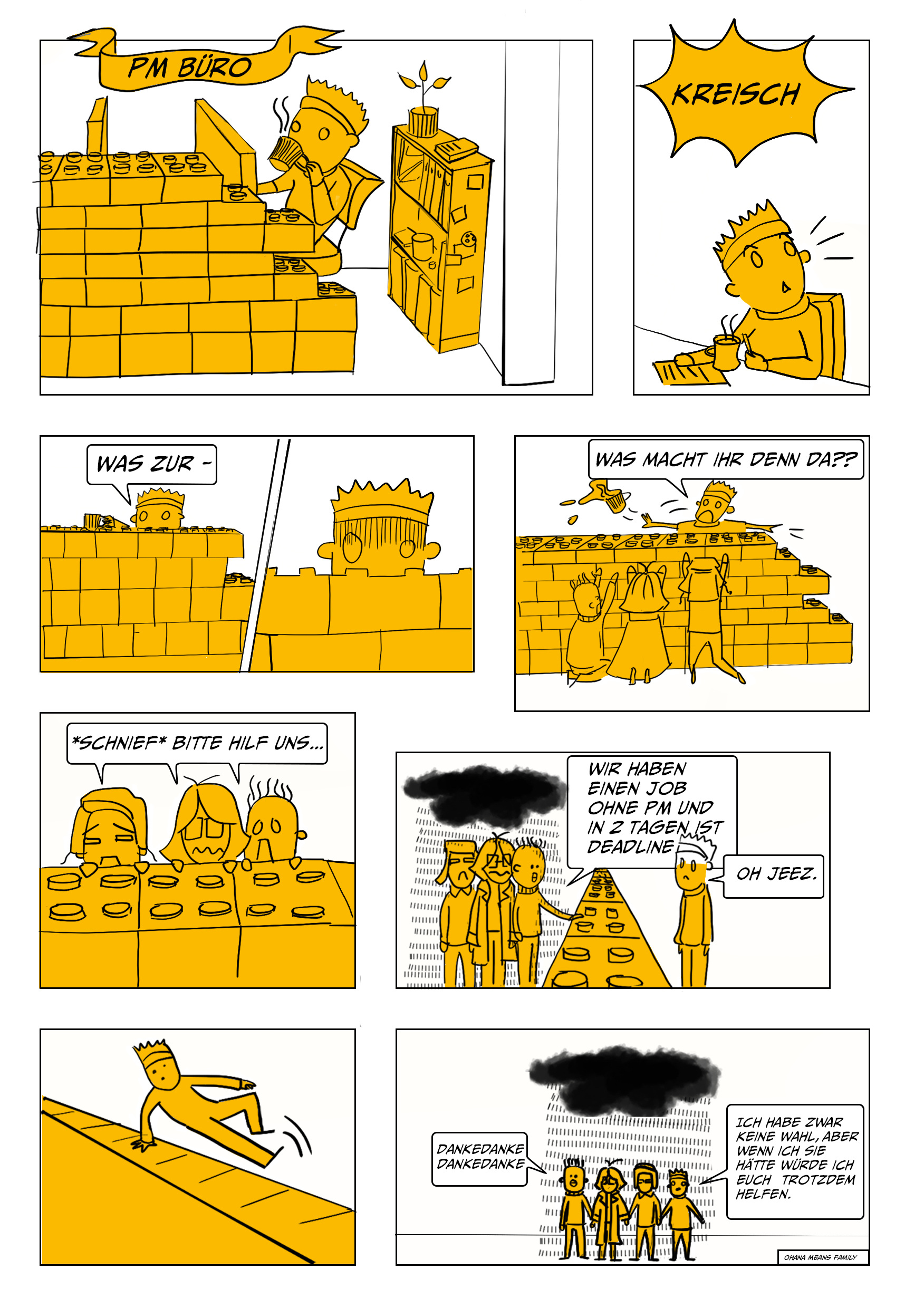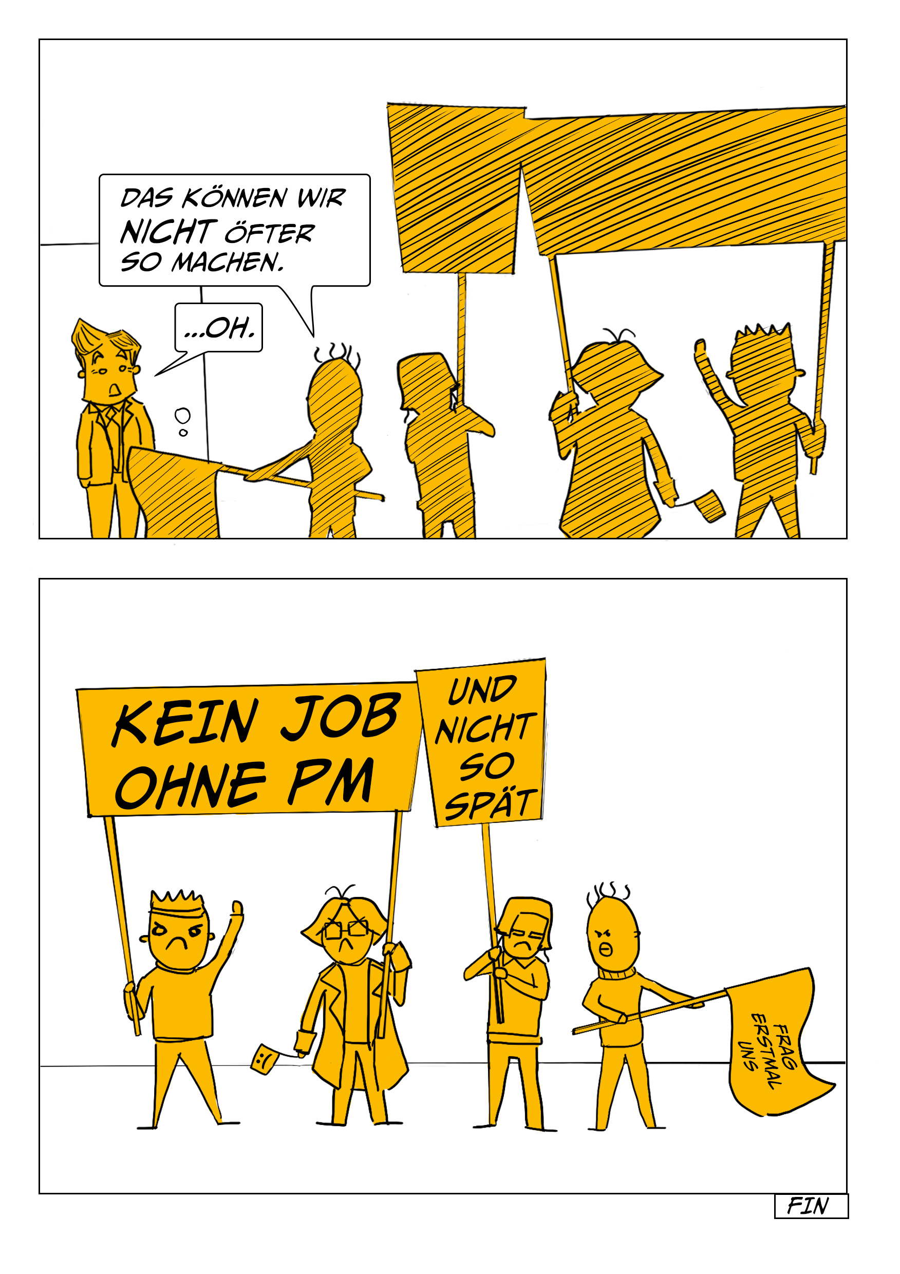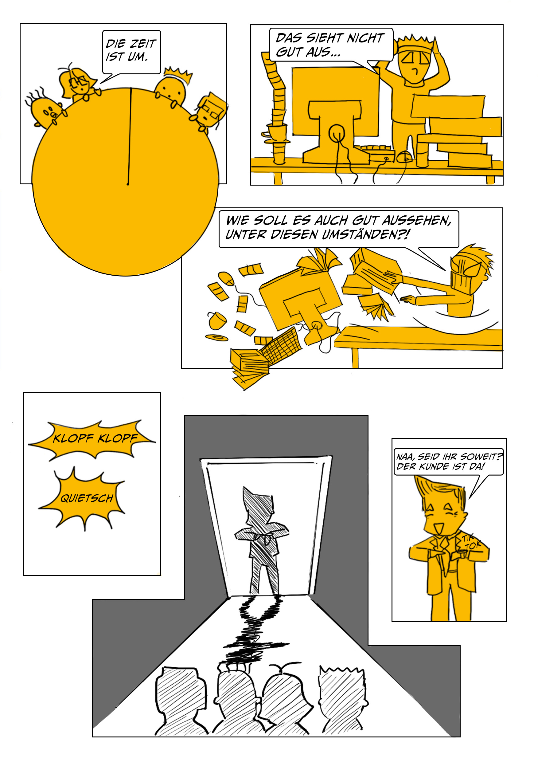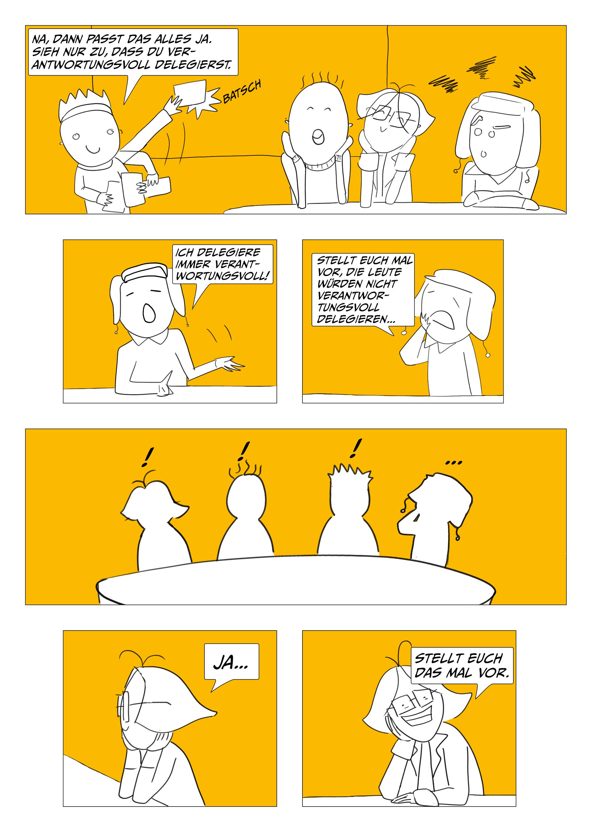 Um die gute Zusammenarbeit zwischen den unterschiedlichen Rollen in einer Kreativagentur zu fördern, werden worst case und best case scenarios anhand der Zusammenarbeit zwischen Kreation, Projektmanagement, Beratung und Kundschaft vermittelt.